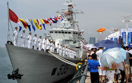 8月9日,觀眾在排隊參觀海軍艦艇。