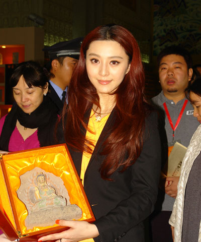 著名影星范冰冰在佛文化藝術(shù)展手捧磚雕佛像