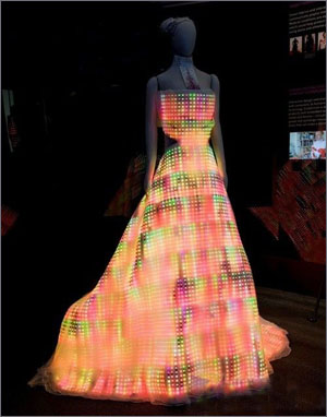 uteCircuit)公司設(shè)計師弗蘭切絲卡·羅塞利亞和瑞安·根茨受美國芝加哥科學(xué)和工業(yè)博物館委托,設(shè)計一件代表時尚創(chuàng)新的服裝,于是催生了這件嵌有2.4萬個發(fā)光二極管的晚禮服。 它有一個貼切的名稱——銀河晚禮服。 該款晚禮服雖然綴滿發(fā)光二極管,卻不笨重:每個發(fā)光二極管都像紙一樣薄,長2毫米。連接二極管的電路設(shè)計得尤其輕薄,手工縫制在一層絲綢上,以便伸展。 設(shè)計師說,發(fā)光二極管應(yīng)用的新技術(shù)不會使裙子溫度過高,想穿“銀河晚禮服”的超級時尚迷們不會感覺炙熱。另外,發(fā)光二極管耗能低,裝在襯裙里的小充電電池足夠點亮它們。
