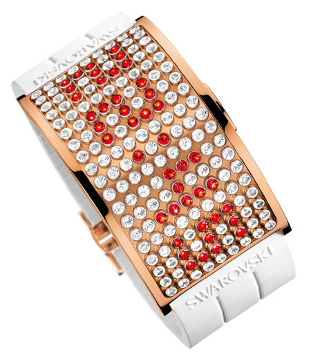▲施華洛世奇以AvantTime概念為靈感的首款限量版D:Light手表綴以171顆施華洛世奇切割仿水晶。該款手表看似如高貴優(yōu)雅的手鏈,卻內(nèi)藏施華洛世奇特別設(shè)計(jì)的機(jī)芯。只要輕按黑色搪瓷襯底,綴以金屬天鵝標(biāo)志的橢圓形按掣,仿水晶就會閃動發(fā)光,并以和諧悅目的橙光顯示時間,在片刻過后如變戲法般消失。