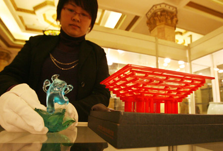 1月5日,工作人員展示上海世博會中國館水晶模型和琉璃“海寶”。