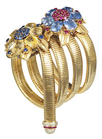 走出森林,隨即踏上了“優(yōu)雅之師”。如果說上一個(gè)展廳體現(xiàn)的是自然美,那么這個(gè)展廳則刻畫了人體美。其間,芭蕾女孩胸針分外奪目。該款基礎(chǔ)為鉑金的作品最早在上世紀(jì)40年代美國的梵克雅寶店誕生。一塊對稱的鉆石勾畫出舞者臉部的輪廓,只見她戴著紅寶石和綠寶石鑲嵌的頭飾,手舞著綠寶石作的扇子。梵克雅寶的工匠們將芭蕾女孩身姿的線條美和舞姿的優(yōu)雅刻畫得淋漓盡致。而這個(gè)作品也被譽(yù)為“美的精靈”。 記者發(fā)現(xiàn),展覽展出的不少首飾在設(shè)計(jì)上也頗為注重實(shí)用性。比如一件鉆石小型多寶化妝盒中,竟然集中了口紅、手表、零錢盒等13種女性出行必不可少的裝備。對于社交場上的女性來說,可謂一件在手,出門無憂。 從女性柔美的世界中走出,接下來便進(jìn)入“搜奇之師”,這里主要展示了描繪世界各地風(fēng)情的飾品。上世紀(jì)30年代“關(guān)注東洋”開始在西方盛行,很多珠寶迷們也將興趣轉(zhuǎn)向神秘的東方世界!八哑妗币庠谔綄|方文化的美麗,并將其融入到珠寶作品中。展示的作品中有描繪中國佛教的墜飾、以日本寺廟為背景的垂墜、富有印度風(fēng)情的鉆石項(xiàng)鏈、刻有埃及壁畫的手鐲……人們不禁感嘆,小小的珠寶,原來可以裝下整個(gè)世界。 而珠寶承載的歷史遠(yuǎn)比我們想像的豐富。一款名為“藍(lán)色火車”的化妝盒就講述了一段傳奇。據(jù)說,兩位商業(yè)大亨打賭,火車和汽車賽跑哪個(gè)快。一方猜火車,一方猜汽車。輸家要為贏家定制一款珠寶飾品。結(jié)果,賭汽車贏的人駕駛自己的座駕真的超過了火車。輸家就在梵克雅寶處定制了刻畫這場曠世車賽場面的首飾盒。盒的表面圖案中,由藍(lán)寶石鑲嵌的火車被綠寶石制成的轎車甩在了后面。
