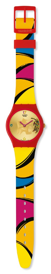 Swatch為這個專屬于中國人的特別節(jié)日奉上了一款生肖腕表——炫虎迎福。這款腕表以時尚設(shè)計與中國傳統(tǒng)風(fēng)格遙相呼應(yīng)。明黃色的腕帶與鮮紅色的帶環(huán)相配,飾以五色相間的彩色條紋。表盤中央印有一個碩大的啞光金色中國漢字“虎”,精致的浮雕工藝令它鮮活而富有層次。表盤上橫跨3點的位置繪制著一只縱身躍起的炫虎,亮麗的紅色指針在表盤中心不停的跳動,記錄著歡悅的分分秒秒。