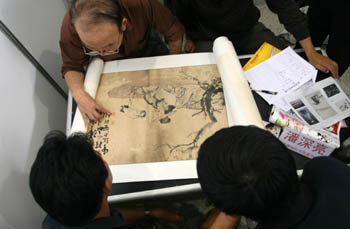 裝裱作偽也是關系到一幅造假字畫成敗之關鍵。 一幅臨摹的贗品字畫弄好后蓋上假章提上假款,就開始進入最后一道程序,就是對字畫進行“做舊”裝裱處理。在內(nèi)地某仿古字畫街上,筆者親眼目睹了裝裱字畫的全過程。 他們所使用的紙張作偽原理也很簡單,即用煙熏、吸潮、茶葉水、促霉等方法使成品表面讓人在觀看、鼻聞、手摸時都能產(chǎn)生古舊的感覺,把偽作保存在放了很多樟腦丸的樟木箱內(nèi)數(shù)日就成。 之后再把成品故意做成十分破損,有的在字畫后面還涂上一些黃泥狀物,給人的感覺就像是拆舊房時從墻上取下來的,有的上面還有很多像針尖一樣的“蟲眼”,讓人一眼看去,這幅字畫就是很久很久以前從前幾輩人那里留傳下來的“古董字畫”。如本人購得一幅齊白石的“蝦”,就是如此裝裱造假的。 這里的造假不背人。老板說,假造的程度你看著達到滿意為止,哪點兒不像,繼續(xù)加工運作,直到買方滿意為止。另外,還有大批量的瓷器、青銅器造假也是當著眾人的面明目張膽地進行。正如老板所言,“我們造假得到的利潤很薄,只要有利就賣,一幅偽作只要能從中賺個10元、8元就可以了,所以每天全國各地的文物販子都會光臨我們這仿古一條街! 字畫造假的手段還有許多。奉勸那些真正喜愛字畫的收藏投資者,不妨多到外邊走走看看,這樣既可開闊眼界,提高鑒賞的水平,又能做到防止上當受騙,從而減少每每交了“學費”后悔不已的心情。 |