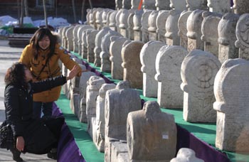 在2009北京國際雕塑公園新春文化廟會上,由天津運來的近300對明清時期大型京津門墩亮相廟會,供游人在逛廟會的同時欣賞。資料照片 |
