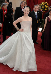 如果說(shuō)奧斯卡是一個(gè)娛樂(lè)圈的名利場(chǎng),那么奧斯卡紅毯無(wú)疑就是專(zhuān)屬于女明星的PK臺(tái)。臺(tái)灣一位時(shí)尚評(píng)論家曾說(shuō)“對(duì)于不少女明星而言,在紅毯上穿得恰到好處甚至比捧得小金人更為重要”。與以往紅毯上最受推崇的紅、黑、白的主流色調(diào)略有不同,今年女明星們似乎更傾向于選擇多樣的淺色系禮服。銀色、淺灰色、淡香檳色、淡藕荷色等明快的色彩都讓紅毯兩側(cè)的觀眾眼前一亮。如新上位女星阿曼達(dá)·塞弗里德選擇的阿瑪尼高級(jí)定制中的白色拽地禮服,硬朗的材質(zhì)配上極簡(jiǎn)的剪裁,不溫不火地流露出公主般的甜美氣質(zhì)。加上阿曼達(dá)年輕的容顏和身段,這一搭配讓不少評(píng)論界的“毒舌派”都大贊其紅毯表現(xiàn)毫不遜色于T臺(tái)上專(zhuān)業(yè)模特的演繹。 海倫·米倫的銀灰色透明紗裹長(zhǎng)裙端莊而不失高貴,亮片畫(huà)龍點(diǎn)睛增添華麗效果,周身上下銀色主打,與一頭銀發(fā)相得益彰;上屆女主角得主萊溫斯特今次的亮相足夠驚艷,簡(jiǎn)潔的銀色裹胸與淺銀灰窄長(zhǎng)裙搭配,展現(xiàn)的是圣羅蘭風(fēng)貌的干練優(yōu)雅;最佳導(dǎo)演獲得者、女導(dǎo)演凱瑟琳·比奇洛以一身銀灰色心形盤(pán)花蕾絲拼接長(zhǎng)裙亮相,盡顯理性之美。 當(dāng)然,也有明星因信奉于保守顏色的魅力而選擇深色系禮服,而這也碰巧因?yàn)榻衲昙t毯上淺色服飾的驟增而顯得分外搶眼?死蚪z汀·斯圖爾特正是勝在黑色禮服上的一位明星。她選擇的純黑色莫尼克·魯里耶禮服頗具設(shè)計(jì)感,且整體感覺(jué)簡(jiǎn)潔,恰好符合她年輕、時(shí)髦的特質(zhì)。有評(píng)論人士認(rèn)為,在這次紅毯秀中莫尼克·魯里耶甚至可以稱(chēng)得上是“年輕女星的楷!。