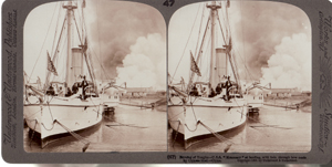 燃燒的塘沽:正在停靠的美國(guó)“莫諾卡西”號(hào),船身帶有被中國(guó)炮彈擊中的洞。銀鹽照片,1900年。 |