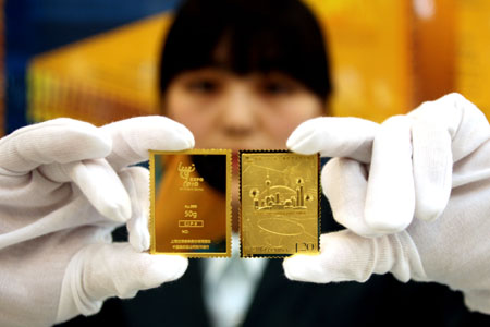 為紀(jì)念中國(guó)2010年上海世博會(huì)開(kāi)幕,中國(guó)郵政發(fā)行《中國(guó)2010年上海世博會(huì)開(kāi)幕紀(jì)念》郵票一套一枚,日前,中國(guó)集郵總公司以開(kāi)幕郵票圖案特別制作發(fā)行《〈中國(guó)2010年上海世博會(huì)開(kāi)幕紀(jì)念〉郵票金磚》一組三款。這是繼中國(guó)郵政發(fā)行《〈開(kāi)國(guó)大典〉郵票金磚》及《〈庚寅年〉郵票金磚》之后第三組編號(hào)限量發(fā)行的郵票金磚。 |
