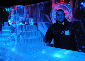 這家冰雕博物館用從瑞典運(yùn)來的70噸冰雕成34種晶瑩透體的景物,其中有北歐老人、手提籃子的婦人、北極熊、小鳥、馴鹿,還有船只、酒吧、小橋、會(huì)議室等。里面還用土耳其生產(chǎn)的100噸冰作為冰的圍墻。 |