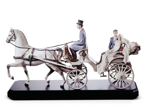 雅致(LLADRO)的華貴瓷藝是歷年來雅致作品中最具藝術(shù)表達(dá)力的一個系列。該系列中作品“新娘馬車”最令人嘆為觀止之處在于它完全不依靠其他支撐點或陶瓷底座,僅靠三條馬腿和四個輪子支撐重量。此外,這件作品對于細(xì)節(jié)的刻畫極盡精致唯美。新娘雍容華貴的婚紗上刺繡著精致的花紋、長長的裙擺間微微的褶皺、頭發(fā)后飄散的精美長披巾,以及裙擺下微露的繡花花邊均是雅致精湛瓷藝的呈現(xiàn)。