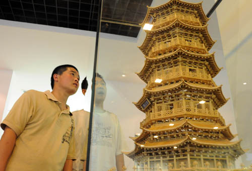 在石家莊民間工藝博物館,一名參觀者正在觀看河北永清藝人創(chuàng)作的秸稈扎刻作品“應縣木塔”。日前,石家莊民間工藝博物館開館迎客,館內收藏了河北省30多類具有濃郁地方特色的民間藝術精品,并全天候向社會公眾免費開放。