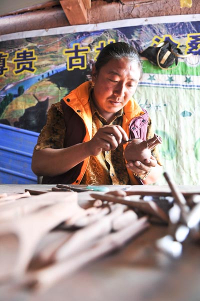 囊謙縣藏黑陶藝人白瑪群加在為一件陶器拋光。 |