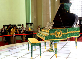由民政部、中國社會工作協會等主辦的首屆“全國民間文化藝術精品上海公益博覽周”日前在上海展覽中心開幕。曾被美國流行音樂天王邁克爾·杰克遜珍藏的孔雀石鋼琴等500多件珍貴展品將在這里公開展出7天,并于7月31日進行公益拍賣。 這架鋼琴被主辦方放置在展覽中心一層中央大廳的正中間位置。琴身主體材料為孔雀石,并用大量黃金、珠寶作裝飾,整琴重達639公斤,極為奢華。這架鋼琴有130多年的歷史,原為俄國皇室所有,后輾轉被多名世界樂壇名流收藏,其中就包括邁克爾·杰克遜。 據介紹,本次公益拍賣會共匯集了包括鉆石珠寶、名家畫作、名貴家具等在內的500多件來自于民間的藝術精品,拍品總估價30多億元。主辦方將于7月31日在上海展覽中心舉行義拍,所籌善款全部用于革命老區(qū)貧困家庭兒童的助醫(yī)行動和青海省扶貧工程。