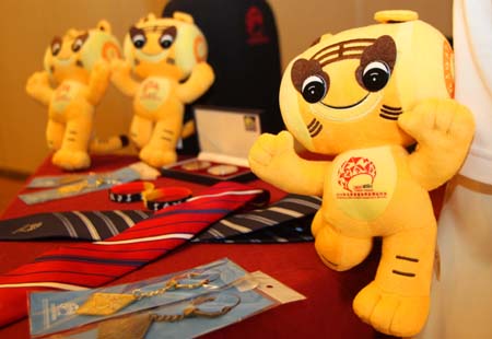 8月10日,2010年北京首屆世界武搏運動會特許產(chǎn)品、紀念郵品新聞發(fā)布會在中成天壇假日酒店舉行。會上發(fā)布了吉祥物、紀念章、鑰匙扣等紀念商品以及個性化郵票票折、明信片等特許郵品,供廣大體育迷與集郵愛好者購買、收藏。圖為武搏會吉祥物“冬冬”。