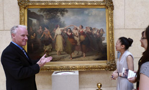 《歐洲經(jīng)典油畫展》日前在北京船藝術(shù)館舉行,展出了28幅有百余年歷史的歐洲經(jīng)典油畫。 圖為來自德國的簡·哈格曼先生向參觀者介紹他收藏的19世紀(jì)比利時藝術(shù)家弗蘭寇斯·沃海丹的油畫《歡慶》。