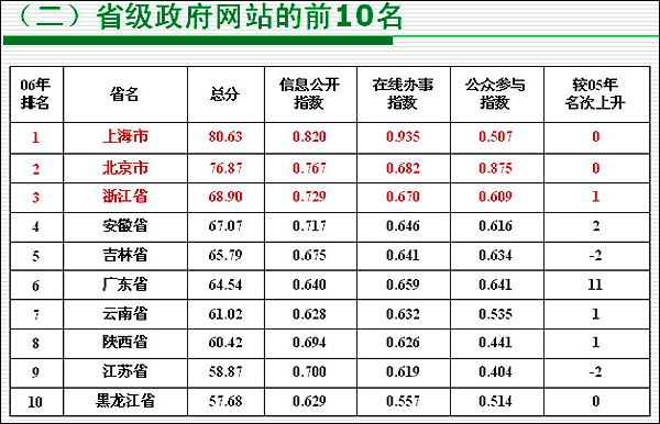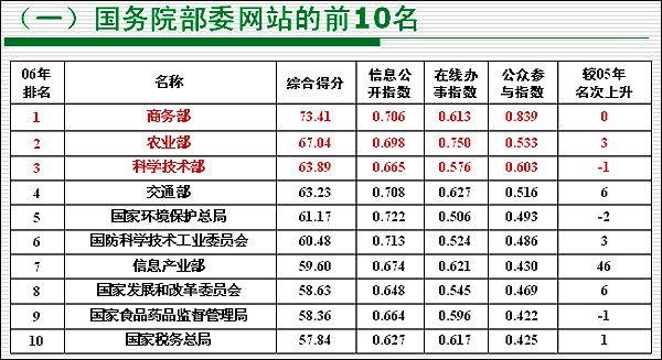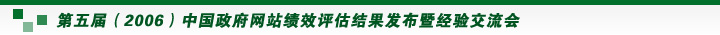 | 2007年1月11日上午9時(shí),由國(guó)務(wù)院信息化工作辦公室主辦,中國(guó)電子信息產(chǎn)業(yè)發(fā)展研究院承辦的“第五屆(2006)中國(guó)政府網(wǎng)站績(jī)效評(píng)估結(jié)果發(fā)布暨經(jīng)驗(yàn)交流會(huì)”在北京召開。國(guó)務(wù)院各部門、省級(jí)政府、副省級(jí)政府、地市級(jí)及縣級(jí)政府約550人參會(huì)。