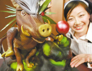 1月23日,在日本東京一個(gè)商場(chǎng)舉行的巧克力展上,一名售貨員在向新聞?dòng)浾呓榻B用巧克力做的35公斤重的野豬。將于24日開(kāi)幕的此次巧克力展吸引了來(lái)自13個(gè)國(guó)家和地區(qū)的60個(gè)品牌的產(chǎn)品參展。該展覽將持續(xù)到情人節(jié)。