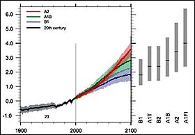 《氣候變化2007:科學基礎》中的氣溫上升示意圖。A1為高經濟發(fā)展情景,人口得到控制。此情景包括:大量使用化石燃料(A1FI)、不使用化石燃料(A1T)、能源種類平衡發(fā)展(A1B)。A2是低經濟增長情景,人口持續(xù)增長。B1假定各國對環(huán)境保