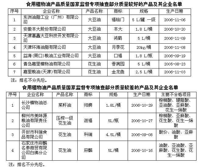為了維護消費者的合法權(quán)益,進一步促進食用植物油行業(yè)的健康發(fā)展,切實從源頭加強食用植物油質(zhì)量安全的監(jiān)督管理,春節(jié)前夕,國家質(zhì)檢總局組織對部分“年貨”食品進行了國家監(jiān)督專項抽查。其中,食用植物油產(chǎn)品共抽查了北京、天津、河北、湖南、上海、江蘇、安徽、廣東、廣西、河南、山東等11個省、直轄市127家企業(yè)生產(chǎn)的140種產(chǎn)品,產(chǎn)品抽樣合格率為93.6%。自2002年開始實施食用植物油市場準(zhǔn)入制度以來,國家質(zhì)檢總局加強了對食用植物油加工企業(yè)的監(jiān)管,食用植物油的產(chǎn)品質(zhì)量比2002年提高了14.4個百分點。