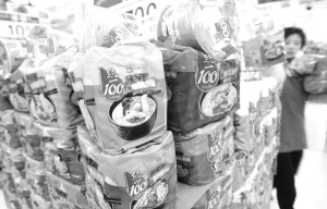 昨天,記者在新街口沃爾瑪超市看到,琳瑯滿目的方便面幾乎占滿超市整整兩大排貨架,有“康師傅”、“統(tǒng)一”、“五谷道場”等10多個品牌,同一品牌還包括不同品種、口味的產(chǎn)品。細(xì)數(shù)一下,僅“統(tǒng)一”旗下就有“好勁道”、“巧面館”、“統(tǒng)一100”等17種之多。 方便面種類繁多,價格差別也很大,如“統(tǒng)一”的“好勁道”系列,5袋一共4.6元,而“日清”的“出前一丁”系列,同樣是5袋連裝,卻是19元。一般來說,袋裝面0.8元到2元之間,桶裝面則是2.5元到4.5元不等。 方便面也十分好賣。短短1個小時,就有10多位市民在貨架前選購,很多市民一買就是好幾大包。 從在超市貨架所占的位置來看,小小方便面的“地位”卻不容小覷。記者走訪了幾家大型超市看到,沃爾瑪超市,方便面占滿兩排長約14米的6層貨架;金潤發(fā)鼓樓店,3排長約8米的8層貨架上全部擺放了方便面,其中桶裝面占據(jù)了1排貨架。同樣的情況也出現(xiàn)在蘇果、家樂福等其他超市。 據(jù)蘇果超市公司內(nèi)部人士透露,方便面之所以受到超市的歡迎,是因為其銷售量十分驚人!疤K果一年的方便面銷售額接近2億元,占到蘇果全年銷售額的3%,食品類銷售額的7%!痹撊耸窟說,其中桶裝面和袋裝面的銷售額比例在2:3左右。 如按袋裝面均價1元、桶裝面均價2.5元、銷售額比例2:3計算,一年僅南京市場上的方便面銷量就為1.67億袋(桶)。南京市人口約640萬,這樣算來,每位南京人一年的方便面消耗量約為26袋(桶)。