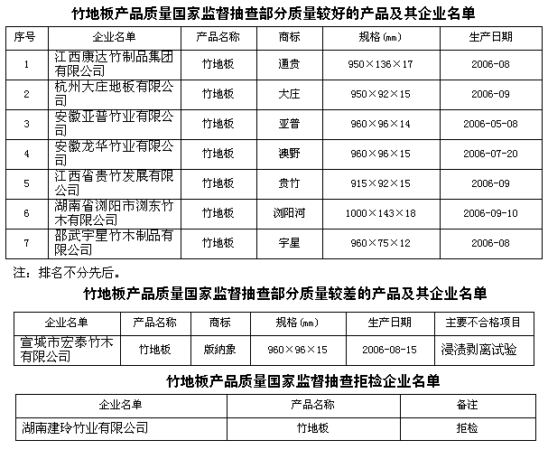 為保障室內(nèi)裝飾裝修材料產(chǎn)品質(zhì)量,維護廣大消費者的合法權益,促進行業(yè)健康發(fā)展,國家質(zhì)檢總局對竹地板產(chǎn)品質(zhì)量進行了國家監(jiān)督抽查,共抽查了浙江、福建、湖南、安徽、江西等5個省50家企業(yè)生產(chǎn)的50種產(chǎn)品,產(chǎn)品抽樣合格率為94%。檢驗的理化指標甲醛釋放量、靜曲強度、硬度、表面漆膜耐污染性、表面漆膜附著力項目全部符合標準的規(guī)定。