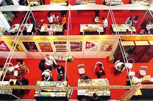 。丛拢玻等,主題為“倡導(dǎo)全民閱讀,建設(shè)和諧文化”的第十七屆全國書市(全國圖書交易博覽會(huì))在重慶國際會(huì)展中心開幕。本屆書市展位1444個(gè),共有1600多家單位出版的21.5萬種圖書和4.5萬種電子音像制品參展。圖為書市展廳一角。