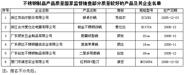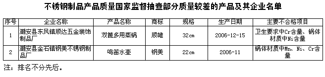 為維護(hù)消費(fèi)者的合法權(quán)益,促進(jìn)不銹鋼制品行業(yè)健康發(fā)展,國家質(zhì)檢總局組織對(duì)不銹鋼制品產(chǎn)品質(zhì)量進(jìn)行了國家監(jiān)督抽查,共抽查了廣東、福建、浙江、上海等4個(gè)省、直轄市30家企業(yè)生產(chǎn)的30種不銹鋼制品,其中不銹鋼器皿28種,不銹鋼餐具2種,產(chǎn)品抽樣合格率為83.3%。