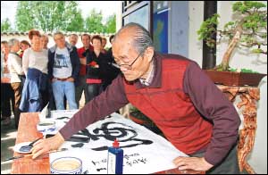 5月8日,中國(guó)菏澤牡丹節(jié)在法國(guó)巴黎近郊圣雷米?奧諾雷市的怡黎園開幕。中國(guó)傳統(tǒng)書畫、樂器展演以及精致的盆景藝術(shù)讓嘉賓們流連忘返。占地6000平方米的怡黎園是法國(guó)第一座中國(guó)傳統(tǒng)園林。圖為一位老人在表演中國(guó)書法。