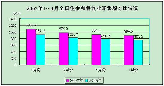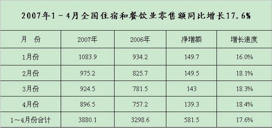 商務部商業(yè)改革司根據(jù)有關數(shù)據(jù)分析,今年4月份,全國住宿與餐飲業(yè)零售額實現(xiàn)896.5億元,同比增長18.4%。今年1-4月份,全國住宿與餐飲業(yè)零售額累計實現(xiàn)3880.1億元,同比增長17.6%,比去年同期增幅高出3.1個百分點,占社會消費品零售總額的比重達到13.9%,拉動社會消費品零售總額增長2.4個百分點,對社會消費品零售總額的增長貢獻率為15.9%。