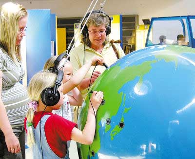 5月27日,在芬蘭首都赫爾辛基市附近的赫尤里卡科學(xué)中心主展廳的地球儀旁,芬蘭兒童頭帶耳機(jī),將耳機(jī)插頭插在地球儀不同的地區(qū),可以聽(tīng)到世界各地60種語(yǔ)言的問(wèn)候。赫尤里卡科學(xué)中心是一個(gè)深受芬蘭兒童歡迎的科技館。它通過(guò)其設(shè)計(jì)新穎、富有哲理的展品對(duì)兒童進(jìn)行深入淺出、寓教于樂(lè)的科普教育,激發(fā)他們對(duì)科學(xué)的興趣。