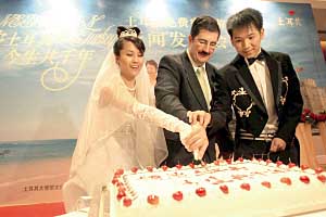 圖為土耳其駐華大使館文化參贊歐盛瑞(中)在發(fā)布會現(xiàn)場與一對新人共切婚禮蛋糕,啟動土耳其蜜月游。
