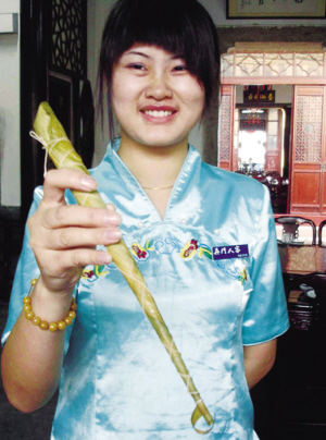 蘇州商家推出多種造型新穎的粽子,吸引消費(fèi)者的目光。圖為銷售人員展示一種筆造型的粽子。 | 南京:紅酒燕窩上陣 八只粽子作陪