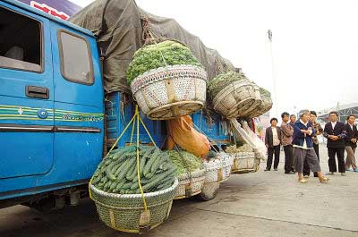6月10日拍攝的被查處的農(nóng)用三輪車。當(dāng)日,一輛運(yùn)送蔬菜的農(nóng)用三輪車在通過安徽蕪湖長江大橋時(shí),被交警查扣。該車狹小的車廂內(nèi)擠了18人,車外掛滿裝有蔬菜的大筐。