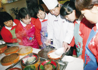 據(jù)民政部門家政服務(wù)中心介紹,今年“金豬寶寶”扎堆,月嫂吃香,而寶寶家庭對(duì)月嫂業(yè)務(wù)能力要求普遍提高,不僅要求能干,還要求技術(shù)科學(xué),例如最基本的做飯,家庭除要求可口之外,更多提出要保證營(yíng)養(yǎng)。圖為月嫂在專業(yè)蒸菜大廚的指導(dǎo)下學(xué)習(xí)蒸菜烹飪。