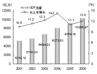 國民經(jīng)濟(jì)保持平穩(wěn)增長。經(jīng)國家統(tǒng)計(jì)局聯(lián)審?fù)ㄟ^,全年實(shí)現(xiàn)上海市生產(chǎn)總值(GDP)10296.97億元,按可比價(jià)格計(jì)算,比上年增長12%,已連續(xù)第15年保持兩位數(shù)增長(見圖1)。其中,第一產(chǎn)業(yè)增加值93.81億元,比上年增長0.8%;第二產(chǎn)業(yè)增加值4997.81億元,增長12.8%;第三產(chǎn)業(yè)增加值5205.35億元,增長11.5%。第三產(chǎn)業(yè)增加值占全市生產(chǎn)總值的比重為50.6%。