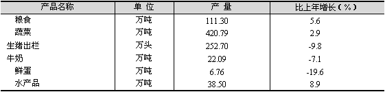 農(nóng)業(yè)經(jīng)濟(jì)保持穩(wěn)定增長。全年完成農(nóng)業(yè)總產(chǎn)值237.89億元,比上年增長0.4%。其中,種植業(yè)產(chǎn)值123.37億元,增長6.6%;畜牧業(yè)產(chǎn)值43.4億元,下降15.5%;漁業(yè)產(chǎn)值55.66億元,增長6.4%。 農(nóng)業(yè)生產(chǎn)能力繼續(xù)提高。全年糧油作物優(yōu)質(zhì)化率分別達(dá)到95%和70%。全年糧食種植面積達(dá)到16.5萬公頃,糧食產(chǎn)量達(dá)到111.3萬噸。主要農(nóng)副產(chǎn)品產(chǎn)量保持穩(wěn)定(見表2)。