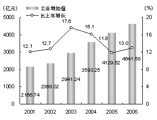 食用農(nóng)產(chǎn)品安全性進(jìn)一步提高。已認(rèn)證無公害農(nóng)產(chǎn)品、安全衛(wèi)生優(yōu)質(zhì)農(nóng)產(chǎn)品、有機(jī)食品和綠色食品356個(gè),形成品牌農(nóng)產(chǎn)品100多個(gè)。加快推進(jìn)有機(jī)農(nóng)業(yè)發(fā)展,全年有機(jī)肥推廣使用面積5.33萬公頃,綠肥種植面積2.19萬公頃。 農(nóng)業(yè)基礎(chǔ)設(shè)施進(jìn)一步完善。全年市區(qū)兩級(jí)政府農(nóng)業(yè)投入達(dá)到45億元,比上年增長17%。至年末,全市建成5.53萬公頃設(shè)施糧田、0.67萬公頃設(shè)施菜田。建成農(nóng)業(yè)標(biāo)準(zhǔn)化示范區(qū)(場)203個(gè),其中國家級(jí)37個(gè)。農(nóng)業(yè)組織化程度繼續(xù)提高。全市有12個(gè)市級(jí)現(xiàn)代農(nóng)業(yè)園區(qū);有農(nóng)業(yè)產(chǎn)業(yè)化龍頭企業(yè)425家,農(nóng)業(yè)專業(yè)合作社510家,帶動(dòng)農(nóng)戶52萬戶。 三、工業(yè)和建筑業(yè) 工業(yè)生產(chǎn)保持快速增長。全年實(shí)現(xiàn)工業(yè)增加值4641.58億元,比上年增長13%(見圖3)。其中規(guī)模以上工業(yè)增加值4456.04億元,增長13.4%。在規(guī)模以上工業(yè)增加值中,輕工業(yè)增加值1223.64億元,增長6.4%;重工業(yè)增加值3232.4億元,增長16.3%。全年工業(yè)總產(chǎn)值19631.23億元,比上年增長13.9%,其中規(guī)模以上工業(yè)總產(chǎn)值18316.23億元,增長14.7%。