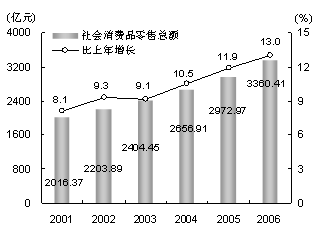 商業(yè)布局與結(jié)構(gòu)調(diào)整步伐加快,市場流通規(guī)模繼續(xù)擴(kuò)大。全年批發(fā)和零售業(yè)實(shí)現(xiàn)增加值919.43億元,比上年增長9.1%。 消費(fèi)品市場銷售活躍。全年實(shí)現(xiàn)社會(huì)消費(fèi)品零售總額3360.41億元,比上年增長13%,增幅創(chuàng)1998年以來最高(見圖5)。其中,吃的商品零售額1328.3億元,增長13.3%;穿的商品零售額425.7億元,增長11.6%;用的商品零售額1566.55億元,增長12.8%。餐飲業(yè)、家居和通訊類商品全面增長。全年餐飲業(yè)實(shí)現(xiàn)零售額452.16億元,比上年增長29%;家居類商品實(shí)現(xiàn)零售額393.2億元,增長15.3%;通訊類商品實(shí)現(xiàn)零售額92億元,增長17.9%。主要耐用消費(fèi)品銷售穩(wěn)步增長。全年汽車零售量9.6萬輛,比上年增長5.3%,其中轎車8.8萬輛,增長5.7%;移動(dòng)電話230.29萬部,增長23.5%;攝像機(jī)6.55萬臺(tái),增長9.4%;脫排油煙機(jī)39.18萬臺(tái),增長12.5%。