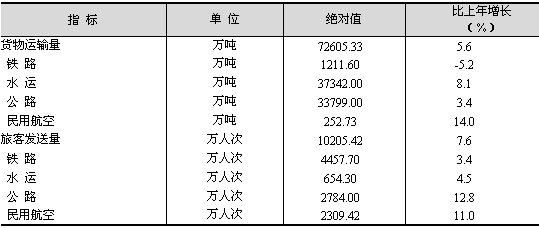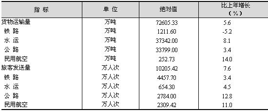 交通運(yùn)輸、倉儲(chǔ)和郵政業(yè)發(fā)展不斷加快。全年實(shí)現(xiàn)交通運(yùn)輸、倉儲(chǔ)和郵政業(yè)增加值683.61億元,比上年增長13.8%。 客貨運(yùn)輸全面增長。全年各種運(yùn)輸方式完成貨物運(yùn)輸總量72605.33萬噸,比上年增長5.6%。旅客發(fā)送總量10205.42萬人次,增長7.6%(見表4)。