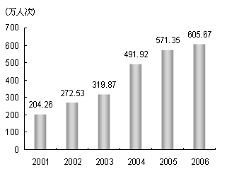 旅游環(huán)境不斷優(yōu)化,服務(wù)水平繼續(xù)提高。全年實(shí)現(xiàn)旅游產(chǎn)業(yè)增加值695.06億元,比上年增長17.8%。 旅游基礎(chǔ)設(shè)施日趨完善。至年末,全市星級(jí)賓館已達(dá)317家,其中五星級(jí)賓館26家。全市已有旅行社879家。其中,國際旅行社53家,國內(nèi)旅行社826家。旅游入境人數(shù)穩(wěn)步增長。全年接待國際旅游入境人數(shù)605.67萬人次,比上年增長6%(見圖6)。其中,入境外國人485.4萬人次,增長7.3%;港、澳、臺(tái)同胞120.27萬人次,增長1%。在國際旅游入境人數(shù)中,過夜旅游人數(shù)464.63萬人次,比上年增長4.5%。國際旅游外匯收入39.61億美元,比上年增長9.8%。全年接待國內(nèi)旅游者9683.97萬人次,比上年增長7.5%,其中外省市來滬旅游者7326.64萬人次,增長7.7%。國內(nèi)旅游收入1419.94億元,比上年增長8.5%。