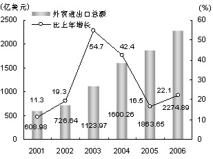 上海口岸環(huán)境進(jìn)一步優(yōu)化。全年上?诎哆M(jìn)出口商品總額4287.54億美元,比上年增長22.3%。其中,進(jìn)口總額1621.89億美元,增長17.3%;出口總額2665.65億美元,增長25.5%。 外貿(mào)進(jìn)出口保持快速增長。全年外貿(mào)進(jìn)出口總額2274.89億美元,比上年增長22.1%(見圖8)。其中,進(jìn)口總額1139.16億美元,增長19.1%;出口總額1135.73億美元,增長25.2%。私營企業(yè)出口保持較快增長。全年私營企業(yè)完成出口115.58億美元,比上年增長54.3%;外商及港澳臺(tái)投資企業(yè)出口759.35億美元,增長23.3%;國有企業(yè)出口248.74億美元,增長20.3%;集體企業(yè)出口12.02億美元,增長23.8%。