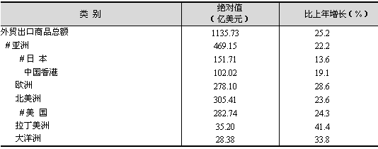 外貿(mào)出口結(jié)構(gòu)進(jìn)一步優(yōu)化。一般貿(mào)易出口增幅繼續(xù)高于加工貿(mào)易。全年一般貿(mào)易完成出口433.04億美元,比上年增長27.7%;加工貿(mào)易出口637.69億美元,增長22.9%。出口產(chǎn)品結(jié)構(gòu)調(diào)整加快,高新技術(shù)產(chǎn)品和機(jī)電產(chǎn)品出口快速增長。全年高新技術(shù)產(chǎn)品出口442.81億美元,比上年增長22.1%,占全市外貿(mào)出口總額的比重達(dá)到39%;機(jī)電產(chǎn)品出口754.15億美元,增長25.2%,占全市的比重達(dá)到66.4%。出口市場多元化戰(zhàn)略進(jìn)一步鞏固(見表7)。
