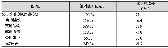 樞紐型、功能性、網(wǎng)絡(luò)化的城市基礎(chǔ)設(shè)施建設(shè)加快推進(jìn)。全年完成城市基礎(chǔ)設(shè)施建設(shè)投資1125.54億元,比上年增長27.1%,占全社會(huì)固定資產(chǎn)投資總額的比重為28.7%。其中,交通運(yùn)輸郵電通信投資703.24億元,市政建設(shè)投資249.84億元,公用事業(yè)投資56.23億元(見表9)。年內(nèi)鐵路上海南站、中環(huán)線浦西段等一批重大城市基礎(chǔ)設(shè)施項(xiàng)目相繼建成并投入運(yùn)營。浦東國際機(jī)場擴(kuò)建工程、上海長江隧橋工程和一批黃浦江越江通道、高速公路等項(xiàng)目加快建設(shè)。全市高速公路網(wǎng)通車?yán)锍踢_(dá)到581公里。