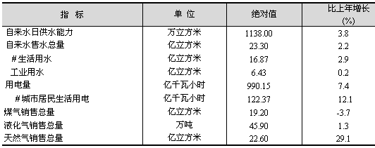 公用事業(yè)綜合服務(wù)水平繼續(xù)提高。全市自來水日供水能力達(dá)到1138萬立方米。全年全市用電量990.15億千瓦小時(shí),比上年增長7.4%。至年末,全市家庭人工煤氣用戶230.02萬戶;家庭液化氣用戶260.5萬戶;家庭天然氣用戶達(dá)到216.9萬戶(見表10)。