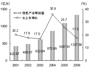 信息產(chǎn)業(yè)繼續(xù)保持平穩(wěn)發(fā)展。全年實(shí)現(xiàn)信息產(chǎn)業(yè)增加值1337.89億元,比上年增長17.5%(見圖9)。其中,信息產(chǎn)品制造業(yè)增加值813.43億元,增長17.2%;信息產(chǎn)品銷售業(yè)增加值24.91億元,增長14.9%;信息服務(wù)業(yè)增加值499.55億元,增長18.1%。全市用于信息化建設(shè)的固定資產(chǎn)投資296.25億元,占全社會(huì)固定資產(chǎn)投資總額的比重為7.5%。