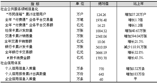 信息技術(shù)應(yīng)用向廣度和深度拓展。政府信息公開內(nèi)容進(jìn)一步深化。全年政府部門主動(dòng)公開信息4.88萬條,依申請(qǐng)公開信息目錄1.18萬條,收到政府信息公開申請(qǐng)7533件,同意公開和部分公開率達(dá)到79.4%。電子政務(wù)網(wǎng)絡(luò)加快建設(shè)。全年“中國上!遍T戶網(wǎng)站主頁訪問量達(dá)2093.46萬人次,實(shí)現(xiàn)網(wǎng)上辦事和服務(wù)1671項(xiàng)。電子口岸平臺(tái)功能進(jìn)一步完善,全年電子口岸平臺(tái)的企業(yè)電子支付金額達(dá)650億元,比上年增長35.4%。全年完成電子商務(wù)交易額1899.65億元,比上年增長17%。數(shù)字證書累計(jì)發(fā)放71.8萬張。信息化發(fā)展環(huán)境日益優(yōu)化。全市累計(jì)有406.3萬人次的市民參加了計(jì)算機(jī)應(yīng)用能力等級(jí)考核,其中188萬人次取得合格證書。 信息基礎(chǔ)設(shè)施服務(wù)能力不斷提升。至年末,集約化信息管線累計(jì)敷設(shè)2451溝公里,比上年末增加830溝公里;互聯(lián)網(wǎng)用戶達(dá)到957萬戶,增加154萬戶;寬帶接入用戶335.2萬戶,增加87.8萬戶;有線電視用戶達(dá)到448.12萬戶,增加20.82萬戶,其中有線電視雙向改造完成200.3萬戶,增加14.64萬戶;衛(wèi)星站點(diǎn)831個(gè),比上年末減少84個(gè)。 社會(huì)公共服務(wù)領(lǐng)域信息化程度進(jìn)一步提高,社會(huì)信用體系不斷完善(見表11)。