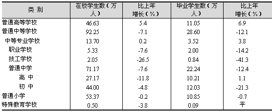 加快高校學(xué)科布局和專業(yè)結(jié)構(gòu)調(diào)整,深化教育綜合改革。至年末,全市共有普通高等學(xué)校60所;普通中等學(xué)校945所;普通小學(xué)626所;特殊教育學(xué)校28所。普通高校在校生和畢業(yè)生數(shù)持續(xù)擴(kuò)大,中等學(xué)校和小學(xué)生在校生和畢業(yè)生數(shù)繼續(xù)下降(見表12)。全市義務(wù)教育階段公辦學(xué)校學(xué)雜費(fèi)全部免除,受益學(xué)生達(dá)到85.1萬人。享受高校幫困獎(jiǎng)學(xué)金的大學(xué)生4.59萬人;實(shí)施中等職業(yè)教育幫困助學(xué)和專業(yè)獎(jiǎng)勵(lì)辦法,減免和獎(jiǎng)勵(lì)2.5萬余名中職學(xué)生的學(xué)費(fèi)。