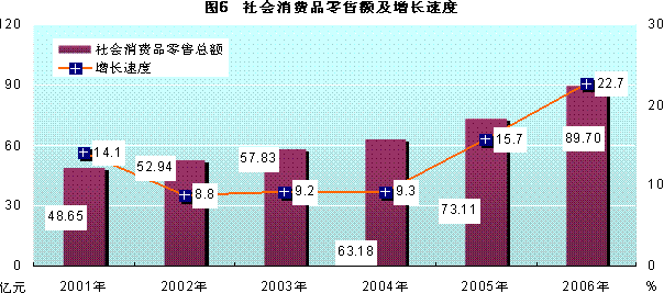 全年實現(xiàn)社會消費品零售總額89.70億元,比上年增長22.7%。其中:城市消費品零售額43.80億元,增長32.7%;縣及縣以下消費品零售額45.91億元,增長14.5%。分行業(yè)看,批發(fā)和零售業(yè)零售額71.61億元,增長21.0%;住宿和餐飲業(yè)零售額15.76億元,增長27.3%;其他行業(yè)零售額2.34億元,增長53.2%。