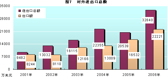 全年進出口總額達3.28億美元,比上年增長59.9%。其中:出口總額2.22億美元,增長34.4%;進口總額1.06億美元,增長1.7倍。