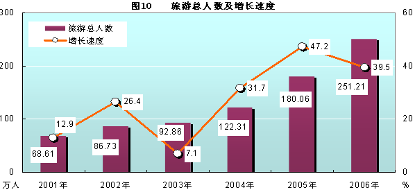 全年接待國內(nèi)外旅游者251.21萬人次,比上年增長39.5%。其中:接待國內(nèi)旅游者235.73萬人次,增長40.4%;接待海外旅游人數(shù)15.48萬人次,增長27.6%。全年實現(xiàn)旅游總收入27.71億元,比上年增長43.2%。實現(xiàn)外匯收入6094萬美元,比上年增長37.1%。